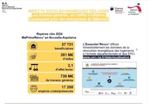 Le professeur Denis Charpin, président de l’APPA*Association pour la Prévention de la Pollution Atmosphérique présente ensuite un état des lieux des risques sanitaires associés au changement climatique. Bénédicte Chautard, cheffe du département habitat au sein de la DREAL*Direction Régionale de l'Environnement, de l'Aménagement et du Logement précise les aides de l’ANAH*Agence Nationale de l'Habitat, qui compte plus de 37 000 bénéficiaires en 2024 en Nouvelle-Aquitaine, et le Service Public de la Rénovation Habitat.