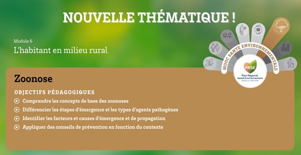 Dans le module 3, « L’enfant et l’adolescent », Cédric Galera, Professeur des universités, Praticien hospitalier, pédopsychiatre et épidémiologiste explique l’éco-anxiété. C’est Denis MALVY, professeur en maladies infectieuses et tropicales au CHU*Centre Hospitalier Universitaire Pellegrin à l’Université de Bordeaux qui a été sollicité dans le module 6, « L’habitant en milieu rural » pour parler des zoonoses.