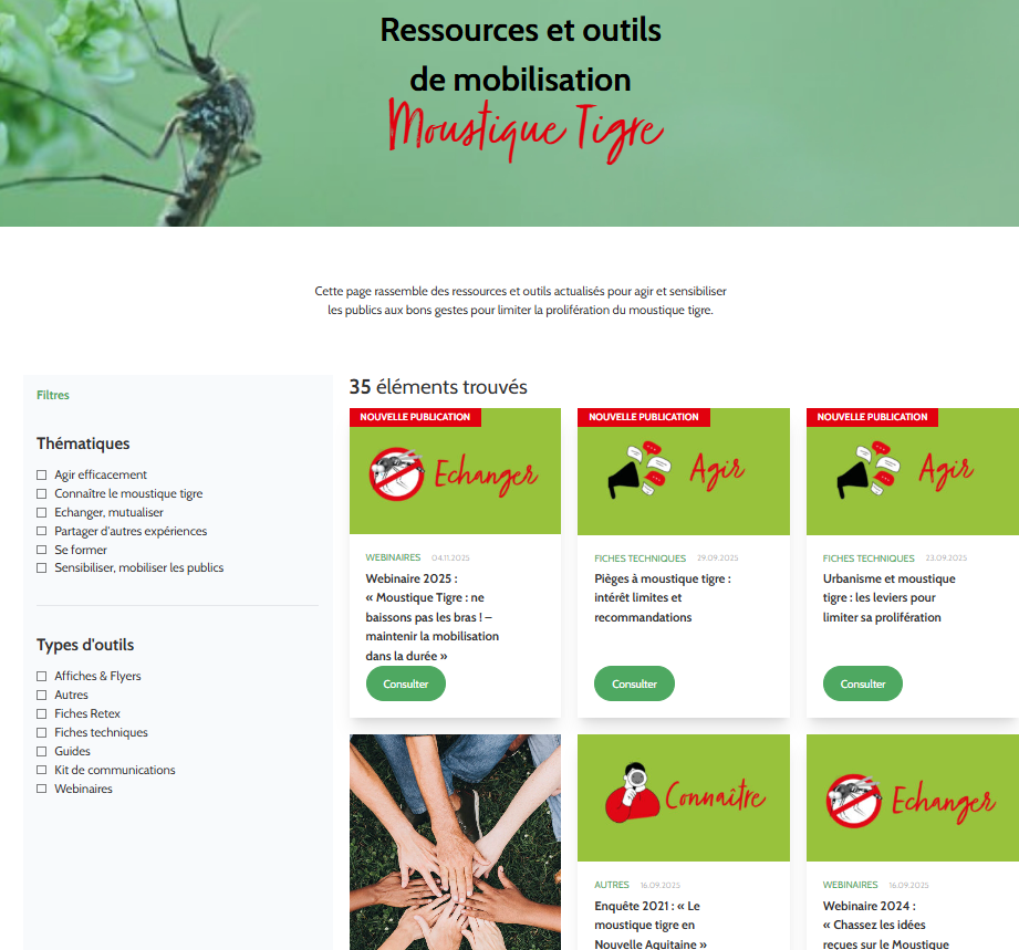 Toutes ces ressources sont rassemblées sur la plateforme Moustique-tigre. Il suffit de s’inscrire pour y accéder. La plateforme a fait peau neuve pour la rentrée. Mise à disposition par l’ARS*Agence Régionale de Santé NA dans le cadre du Plan Régional Santé Environnement (PRSE*Plan Régional Santé Environnement 4) et élaborée par le GRAINE*Crée en 1992, l'association GRAINE Nouvelle Aquitaine (Groupe Régional d’Animation et d’Information sur la Nature et l’Environnement) est un réseau d'acteurs de l'Education à l'Environnement et au Développement Durable (EEDD). Nouvelle-Aquitaine, elle met à disposition les outils, ressources et fiches techniques pour agir sur son territoire et engager des actions de mobilisation sociale.