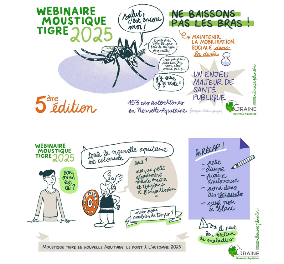 L’année 2025 marquera un tournant dans la lutte contre le moustique tigre en France, avec une épidémie d’une ampleur exceptionnelle. Désormais en Nouvelle-Aquitaine, 1485 communes sont colonisées, soit 71% de la population régionale. En passant de 0 cas autochtone en 2024 à 150 cas autochtones de chikunguya, notamment vers Bergerac, et 3 cas autochtones de dengue, le moustique tigre et ses capacités vectorielles ont été mis en lumière par une couverture médiatique sans précédent. Un risque qui appelle les sociétés à s’organiser collectivement. De nouveaux instruments de l’action publique sont à inventer dont le principe de mobilisation sociale, qui implique des actions d’information, de communication et de mobilisation. C’était le sujet du webinaire annuel « Ne baissons pas les bras » organisé par le Graine NA.
